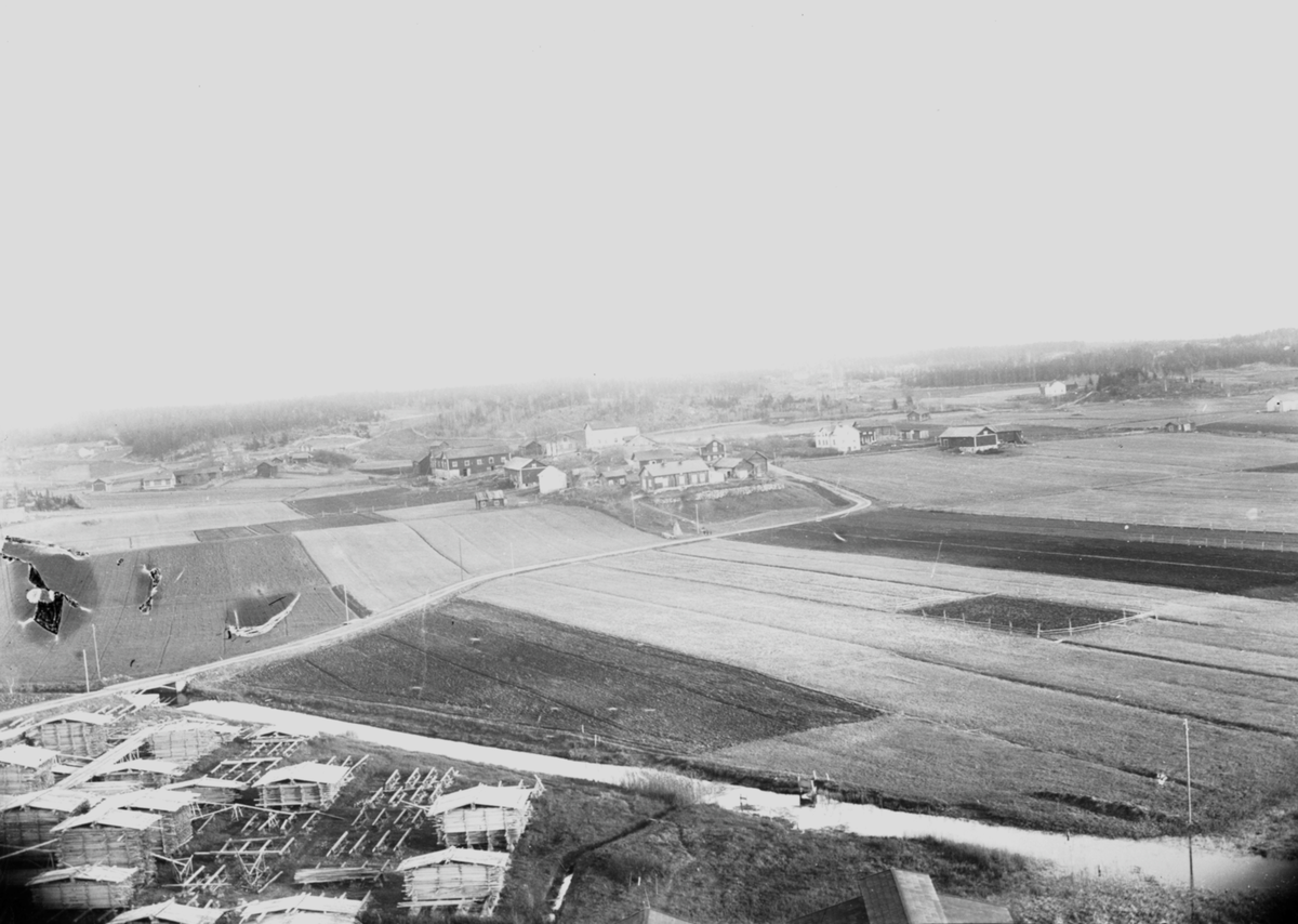Vy över Österhästbo by, Torsåker. Fotot är taget från en av skorstenarna vid Hästbo tegelbruk.