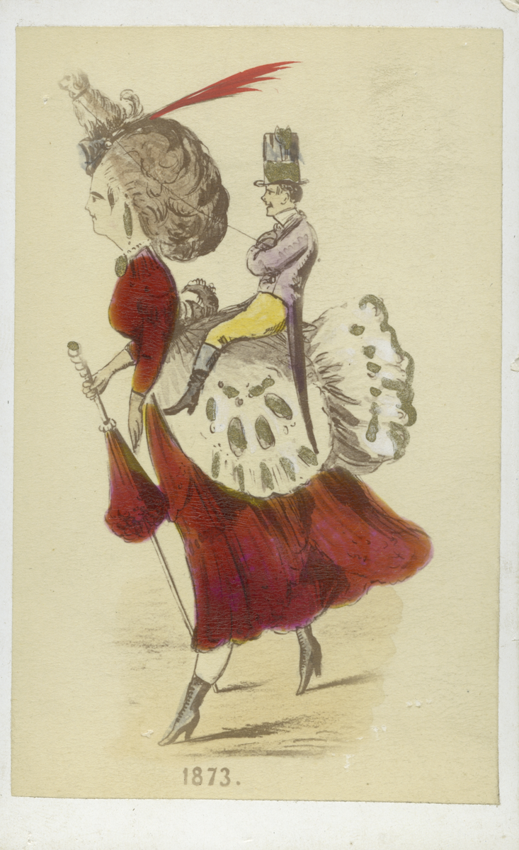 Skämtbild från 1873, föreställande en man sittande på en kvinnas rygg. På baksidan ett klistermärke med text: G. Keller Optiker Götheplatz 9, Frankfurt.