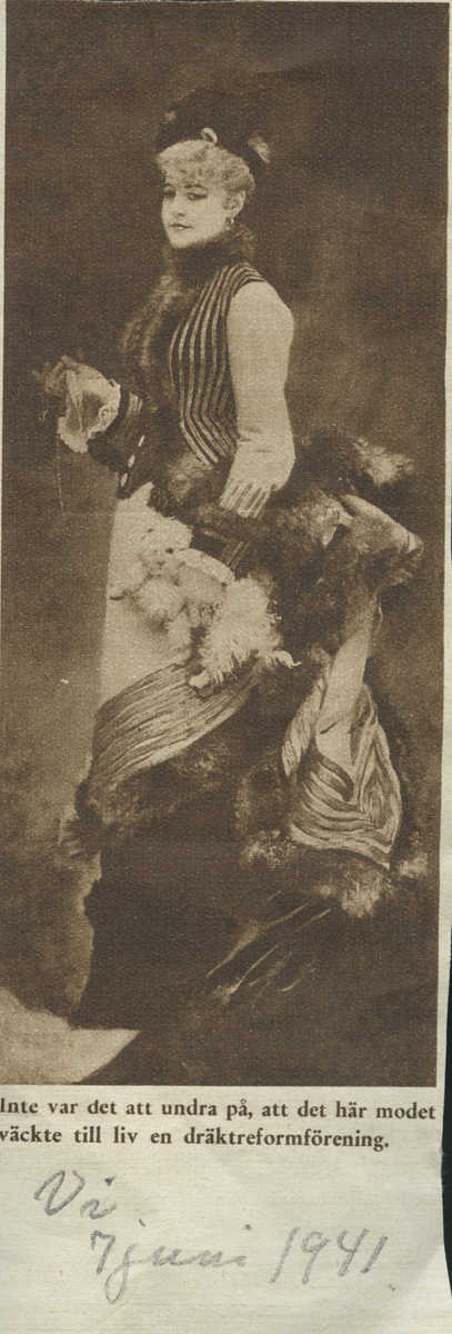 Tidningsurklipp med kvinna i en dräkt. Text på framsidan av urklippet: "Inte var det att undra på, att det här modet väckte till liv en dräktreformförening. Vi, 7 juni 1941".