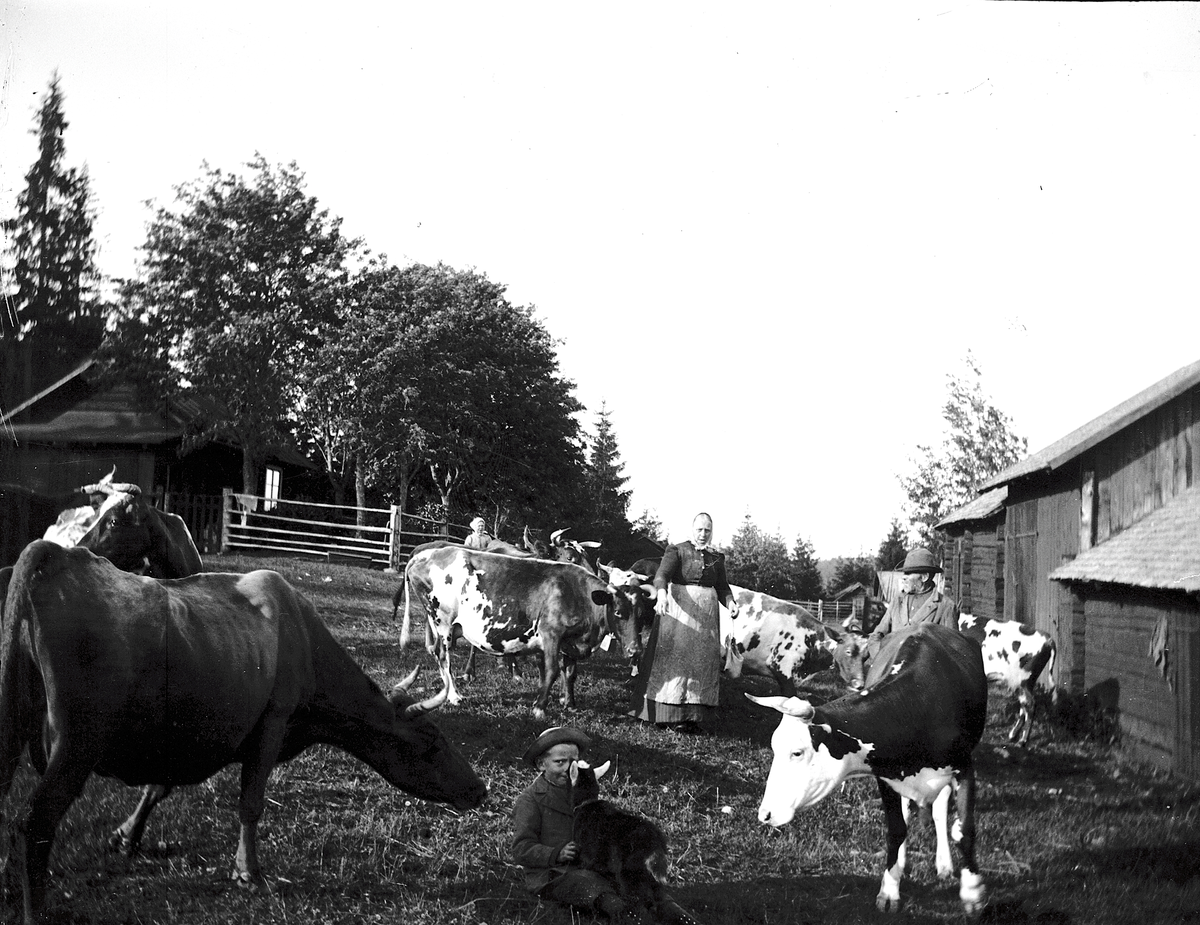 Norrbo fäbod, Torsåker, Hofors kommun. Två kvinnor, en man och en liten pojke tillsammans med några kor och ett lamm.