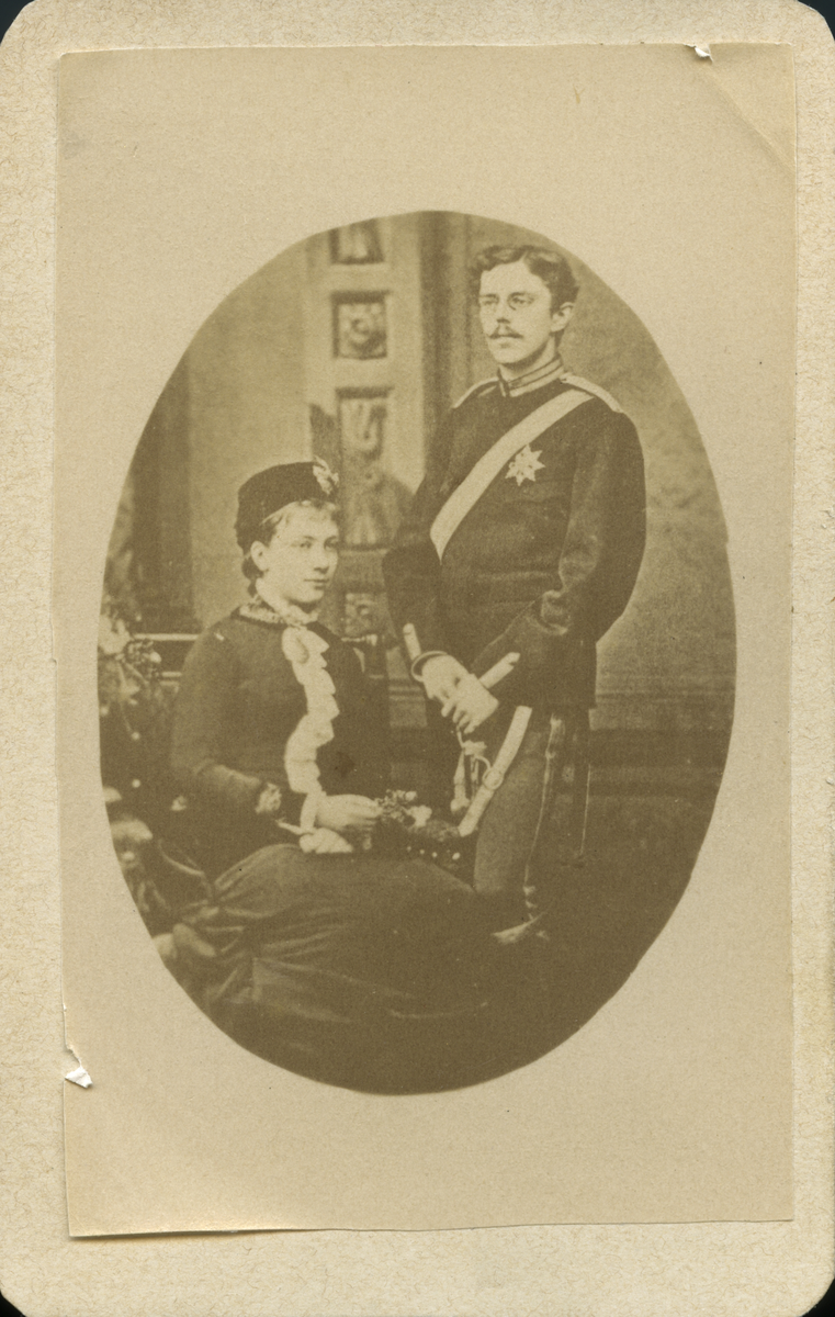 Titel: Porträtt av en kvinna i dräkt och en man i uniform.