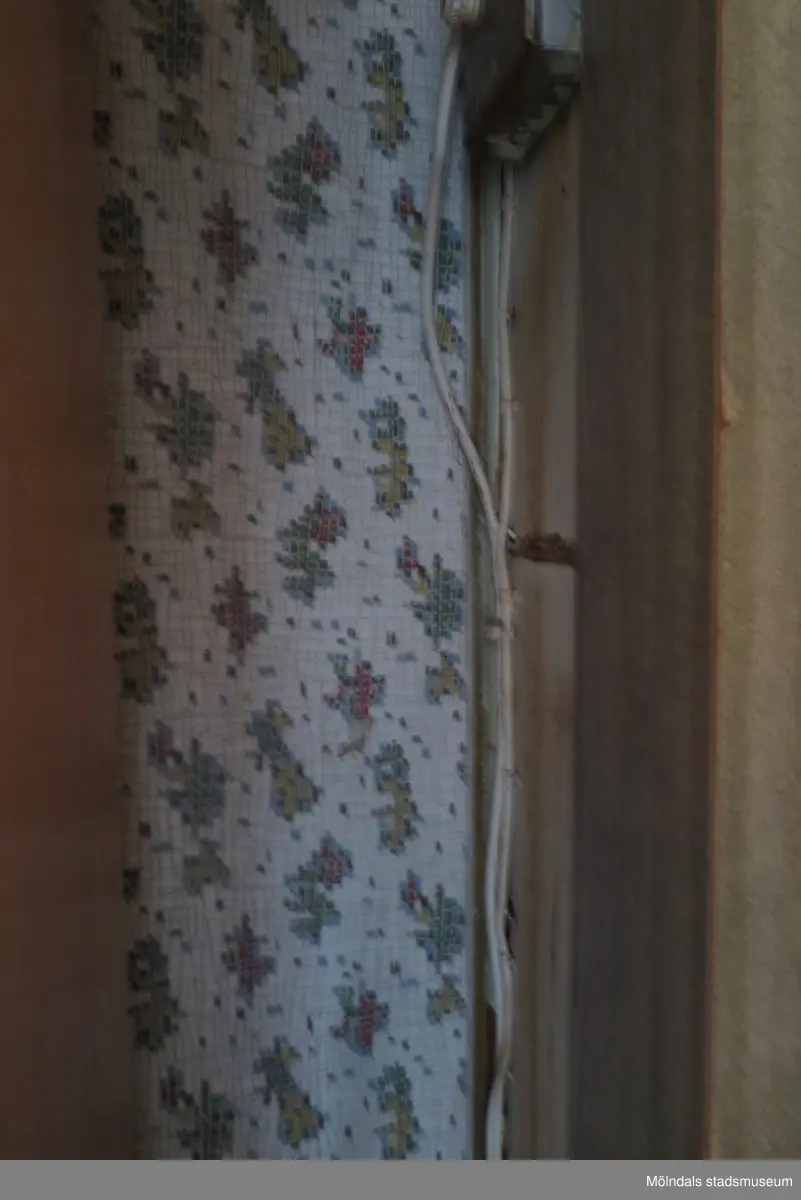Ett smalt utrymme med en mönstrad tapet, Krokslättsgatan 18 i Mölndal 2023-06-21. På väggen till höger i utrymmet ses ett elskåp med tillhörande kablar/sladdar. Fotodokumentation av ett friliggande bostadshus/villa byggt 1932 med fyra (4) våningsplan. Byggnaden har tvättstuga i källaren samt torkvind på övervåningen. Boarea: 140 kvm, totalarea: 1004 kvm. Villan är ombyggd och fördelad på fyra (4) hyreslägenheter.