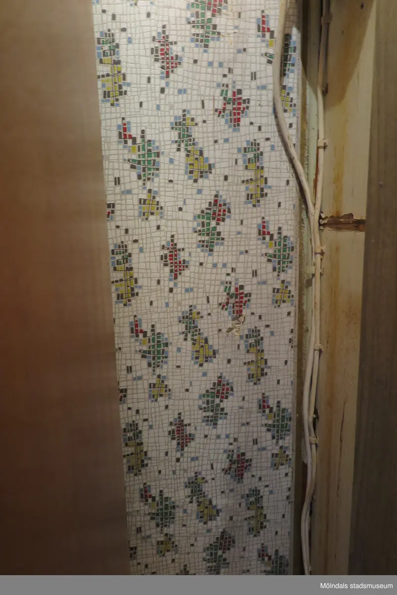 Ett smalt utrymme med en mönstrad tapet (se 2024_1493), Krokslättsgatan 18 i Mölndal 2023-06-21. På väggen till höger i utrymmet ses kablar/sladdar. Fotodokumentation av ett friliggande bostadshus/villa byggt 1932 med fyra (4) våningsplan. Byggnaden har tvättstuga i källaren samt torkvind på övervåningen. Boarea: 140 kvm, totalarea: 1004 kvm. Villan är ombyggd och fördelad på fyra (4) hyreslägenheter.