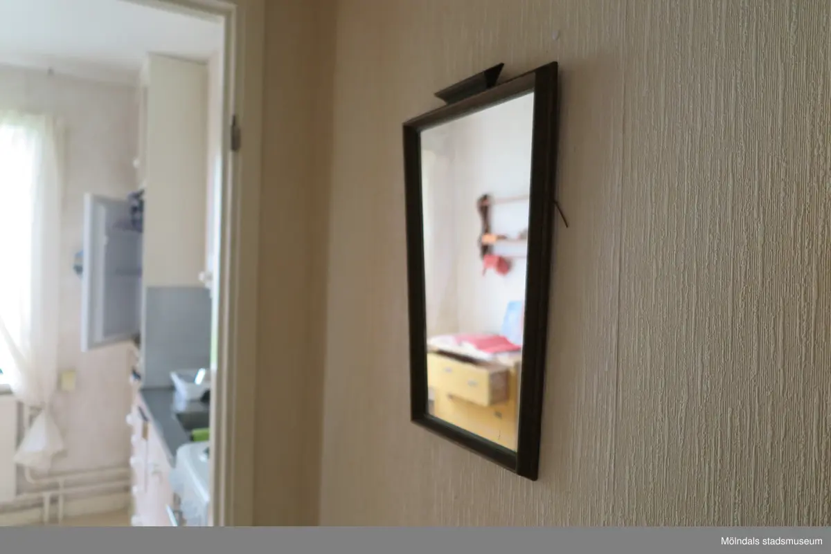 Vy från en hall med mönstrad tapet och hallspegel, mot ett kök med dess inredning (se 2024_1498), Krokslättsgatan 18 i Mölndal 2023-06-21. Fotodokumentation av ett friliggande bostadshus/villa byggt 1932 med fyra (4) våningsplan. Byggnaden har tvättstuga i källaren samt torkvind på övervåningen. Boarea: 140 kvm, totalarea: 1004 kvm. Villan är ombyggd och fördelad på fyra (4) hyreslägenheter.