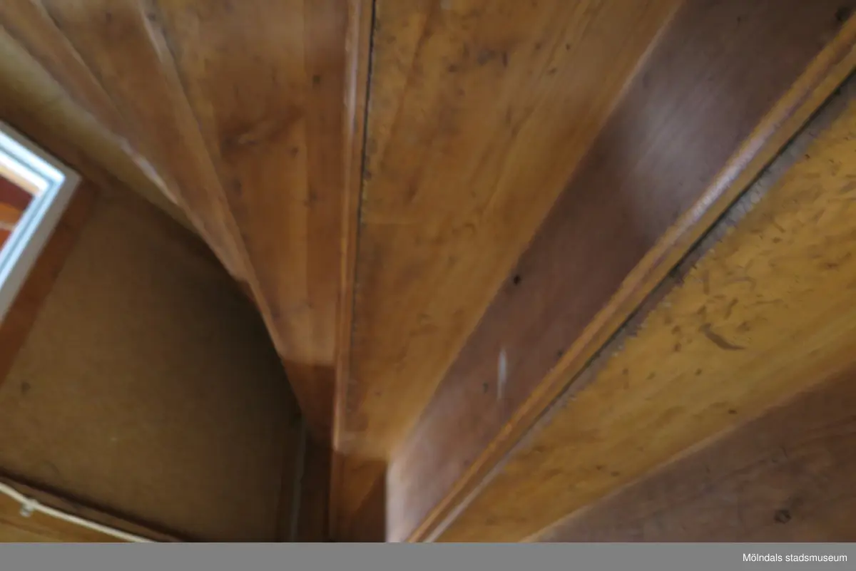 Från källarutrymmet (se 2024_1514) ser man en trätrappa som är fotograferad underifrån, Krokslättsgatan 18 i Mölndal 2023-06-21. Nertill ses en vit elkabel som sitter på väggen. Fotodokumentation av ett friliggande bostadshus/villa byggt 1932 med fyra (4) våningsplan. Byggnaden har tvättstuga i källaren samt torkvind på övervåningen. Boarea: 140 kvm, totalarea: 1004 kvm. Villan är ombyggd och fördelad på fyra (4) hyreslägenheter.