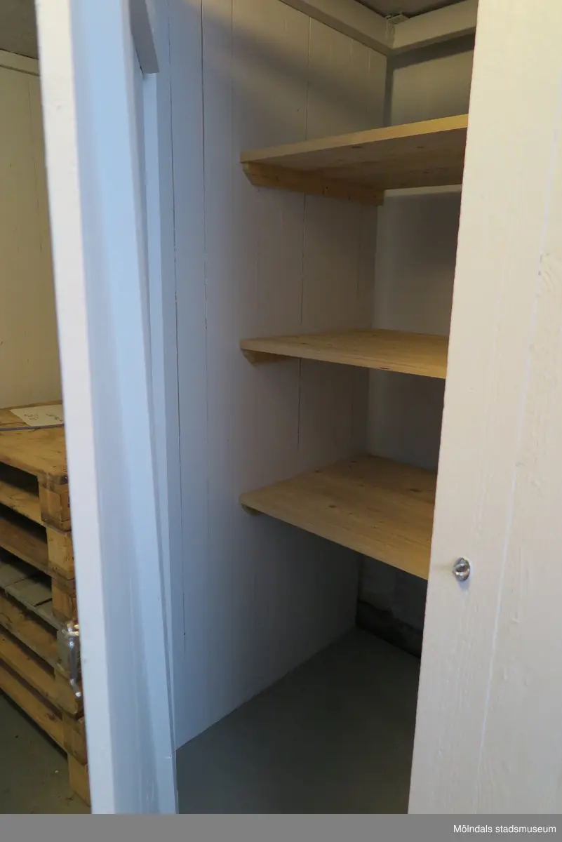 Vänster sida av källaren (se 2024_1517), Krokslättsgatan 18 i Mölndal 2023-06-21. Ett utav förrådsutrymmena med dess hyllor är öppnat och till vänster ses en träpall. Fotodokumentation av ett friliggande bostadshus/villa byggt 1932 med fyra (4) våningsplan. Byggnaden har tvättstuga i källaren samt torkvind på övervåningen. Boarea: 140 kvm, totalarea: 1004 kvm. Villan är ombyggd och fördelad på fyra (4) hyreslägenheter.