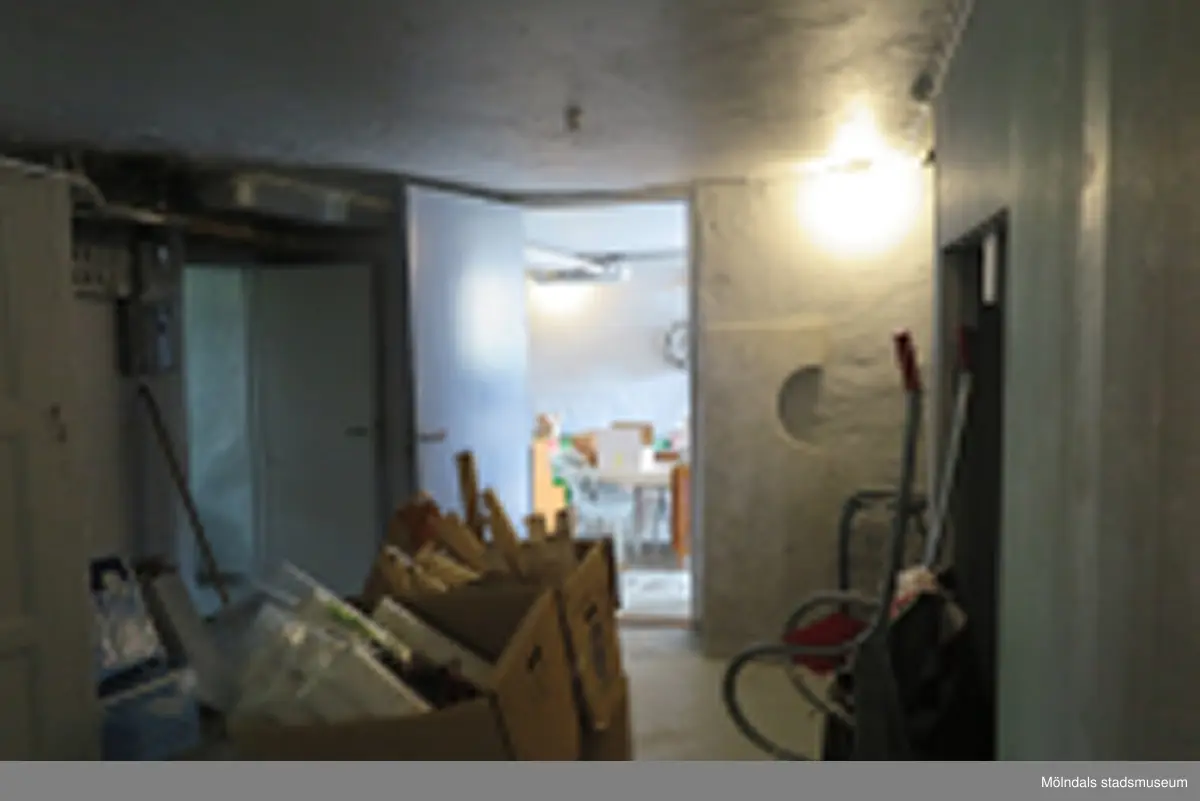 Ett upplyst källarutrymme fullbelamrat med kartonger, skottkärror och diverse prylar, Krokslättsgatan 18 i Mölndal 2023-06-21. Innanför detta rum ses ett annat källarrum fullt av saker. Fotodokumentation av ett friliggande bostadshus/villa byggt 1932 med fyra (4) våningsplan. Byggnaden har tvättstuga i källaren samt torkvind på övervåningen. Boarea: 140 kvm, totalarea: 1004 kvm. Villan är ombyggd och fördelad på fyra (4) hyreslägenheter.