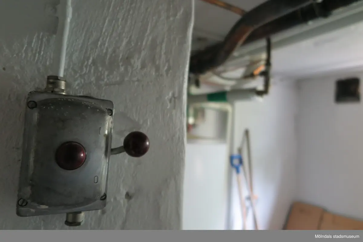 En elkontakt som sitter på en vägg i ett källarutrymme (se 2024_1524), Krokslättsgatan 18 i Mölndal 2023-06-21. I bakgrunden ses diverse saker som står på golvet. Fotodokumentation av ett friliggande bostadshus/villa byggt 1932 med fyra (4) våningsplan. Byggnaden har tvättstuga i källaren samt torkvind på övervåningen. Boarea: 140 kvm, totalarea: 1004 kvm. Villan är ombyggd och fördelad på fyra (4) hyreslägenheter.