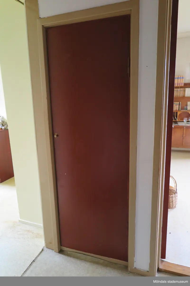 En brunmålad innedörr, Krokslättsgatan 18 i Mölndal 2023-06-21. Till vänster ses del av ett rum och till höger ses del av ett möblerat vardagsrum. Fotodokumentation av ett friliggande bostadshus/villa byggt 1932 med fyra (4) våningsplan. Byggnaden har tvättstuga i källaren samt torkvind på övervåningen. Boarea: 140 kvm, totalarea: 1004 kvm. Villan är ombyggd och fördelad på fyra (4) hyreslägenheter.