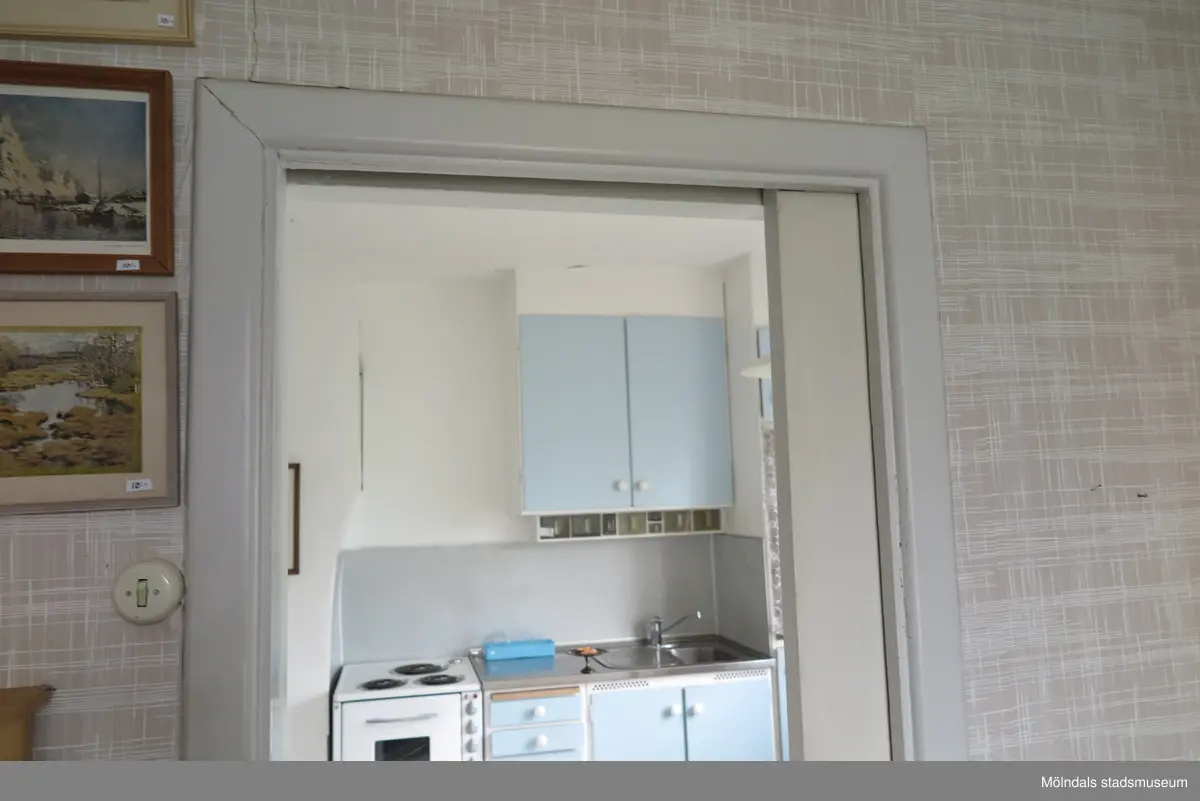 Vy från ett vardagsrum, genom ett valv, mot ett kök (se 2024_1482) vars skåp är målade i ljusblå kulör, Krokslättsgatan 18 i Mölndal 2023-06-21. Fotodokumentation av ett friliggande bostadshus/villa byggt 1932 med fyra (4) våningsplan. Byggnaden har tvättstuga i källaren samt torkvind på övervåningen. Boarea: 140 kvm, totalarea: 1004 kvm. Villan är ombyggd och fördelad på fyra (4) hyreslägenheter.