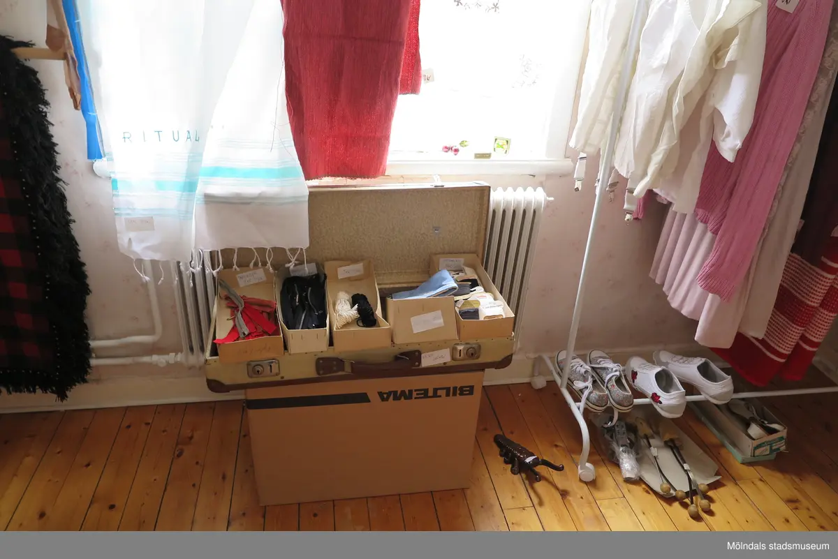 Del av ett rum framför ett fönster (se 2024_1502), med skor och hängande kläder till försäljning, Krokslättsgatan 18 i Mölndal 2023-06-21. Fotodokumentation av ett friliggande bostadshus/villa byggt 1932 med fyra (4) våningsplan. Byggnaden har tvättstuga i källaren samt torkvind på övervåningen. Boarea: 140 kvm, totalarea: 1004 kvm. Villan är ombyggd och fördelad på fyra (4) hyreslägenheter.