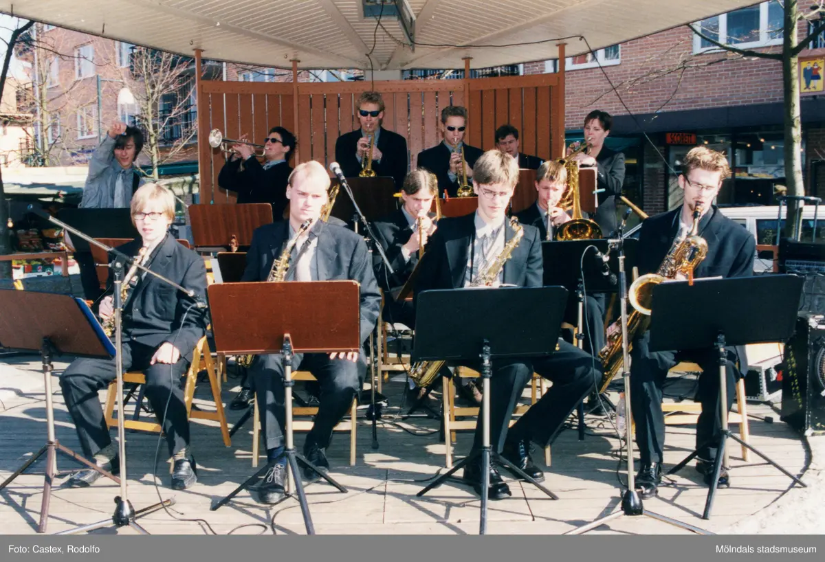 Titel: Påskfirande på Mölndals torg lördagen den 3 april 1999. Frälsningsarméns hornmusikkår spelar på den lilla scenen.