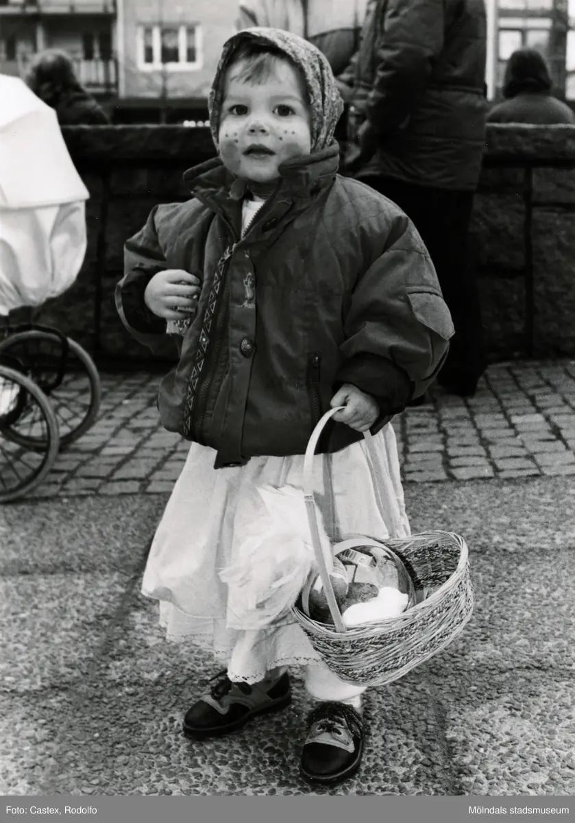 Påskfirande på Mölndals torg, år 1991. Porträtt av en påskkärring.