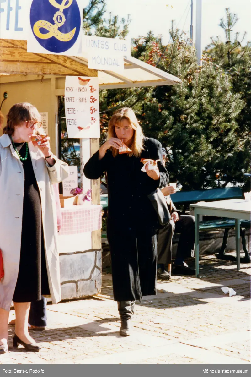 Lions Club anordnar marknad på Stadshusplatsen i Mölndal, tidigt 1980-tal. Två kvinnor äter korv med bröd och dricker Sunkist Apelsin till.