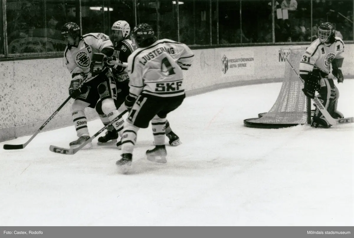 Titel: Ishockeymatch mellan IF Mölndal Hockey och Västra Frölunda HC i Åby ishall, Idrottsvägen 5 i Åby, Mölndal, okänt årtal.