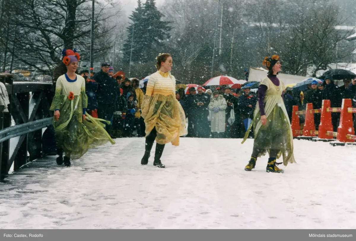 Dansuppvisning vid invigningen av Gunnebo Bro vid Stensjön. Mölndal i mars 1999.