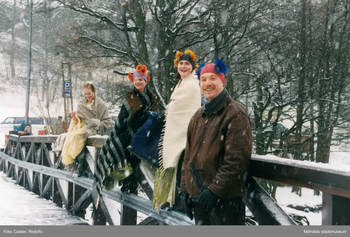 Invigning av Gunnebo Bro vid Stensjön. Mölndal i mars 1999. Porträtt av en man samt de tre dansöserna vid broräcket.