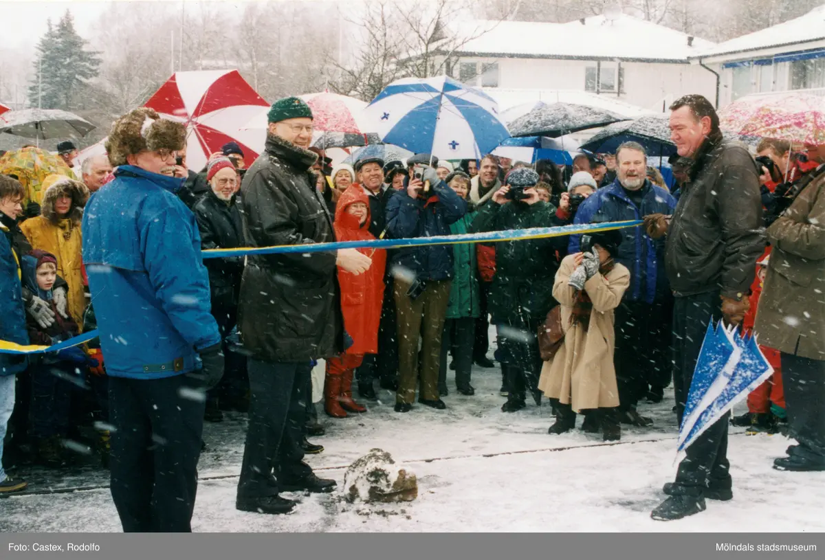 Invigning av Gunnebo Bro vid Stensjön. Mölndal i mars 1999. En man är på väg att klippa bandet.