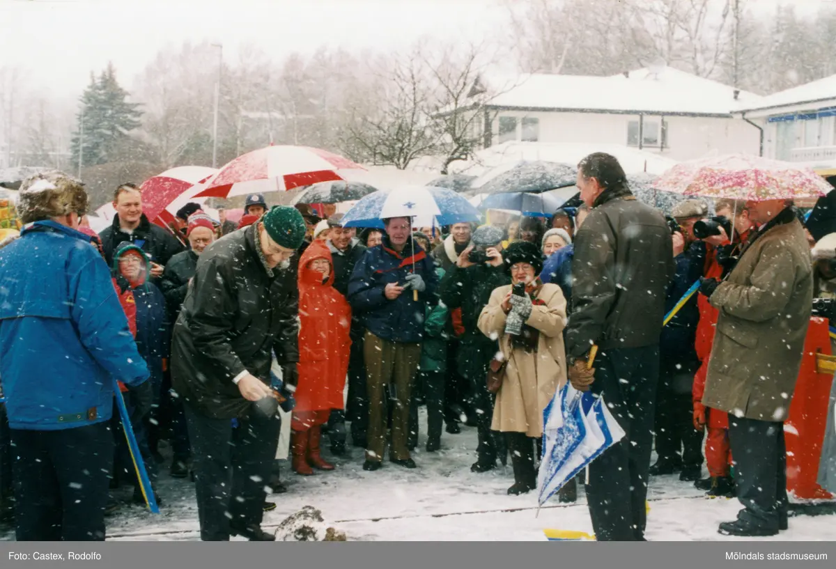 Invigning av Gunnebo Bro vid Stensjön. Mölndal i mars 1999. Bandet har precis klippts av.