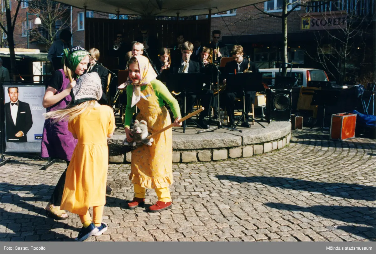 Påskfirande på Mölndals torg lördagen den 3 april 1999. Frälsningsarméns hornmusikkår spelar på den lilla scenen och tre påskkärringar dansar till musiken.