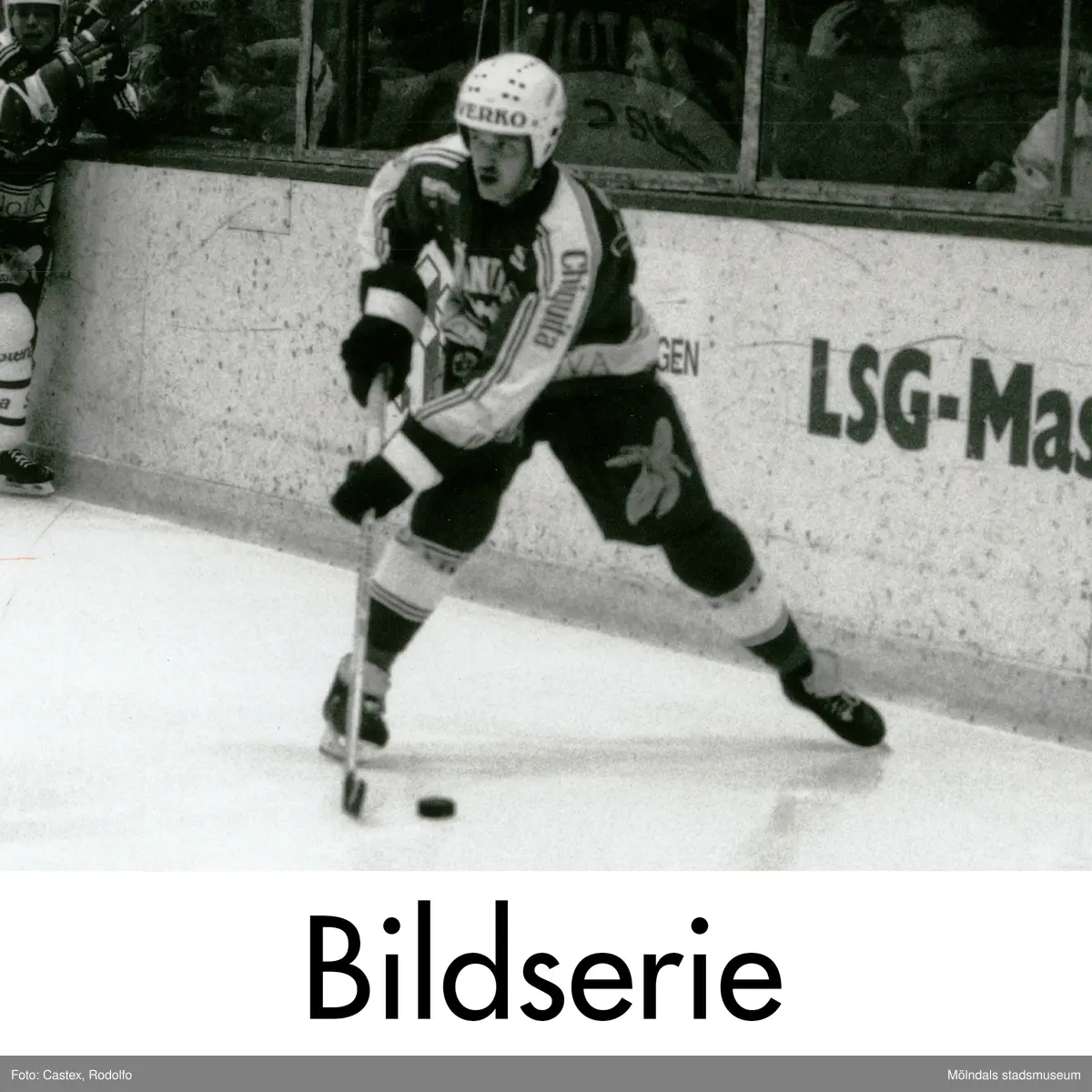 Serie om 16 svartvita fotografier som visar ishockeymatch mellan IF Mölndal Hockey och Västra Frölunda HC i Åby ishall, Idrottsvägen 5 i Åby, Mölndal, okänt årtal.