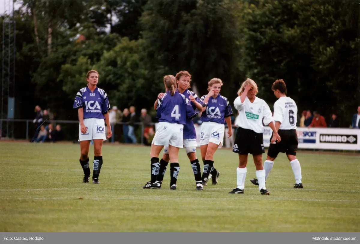Titel: Fotbollslaget Jitex BK spelar match mot Veberöds AIF på Kvarnbyvallen i Mölndal, år 1996.