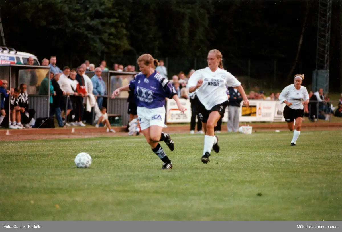 Fotbollslaget Jitex BK spelar match mot Veberöds AIF på Kvarnbyvallen i Mölndal, år 1996.