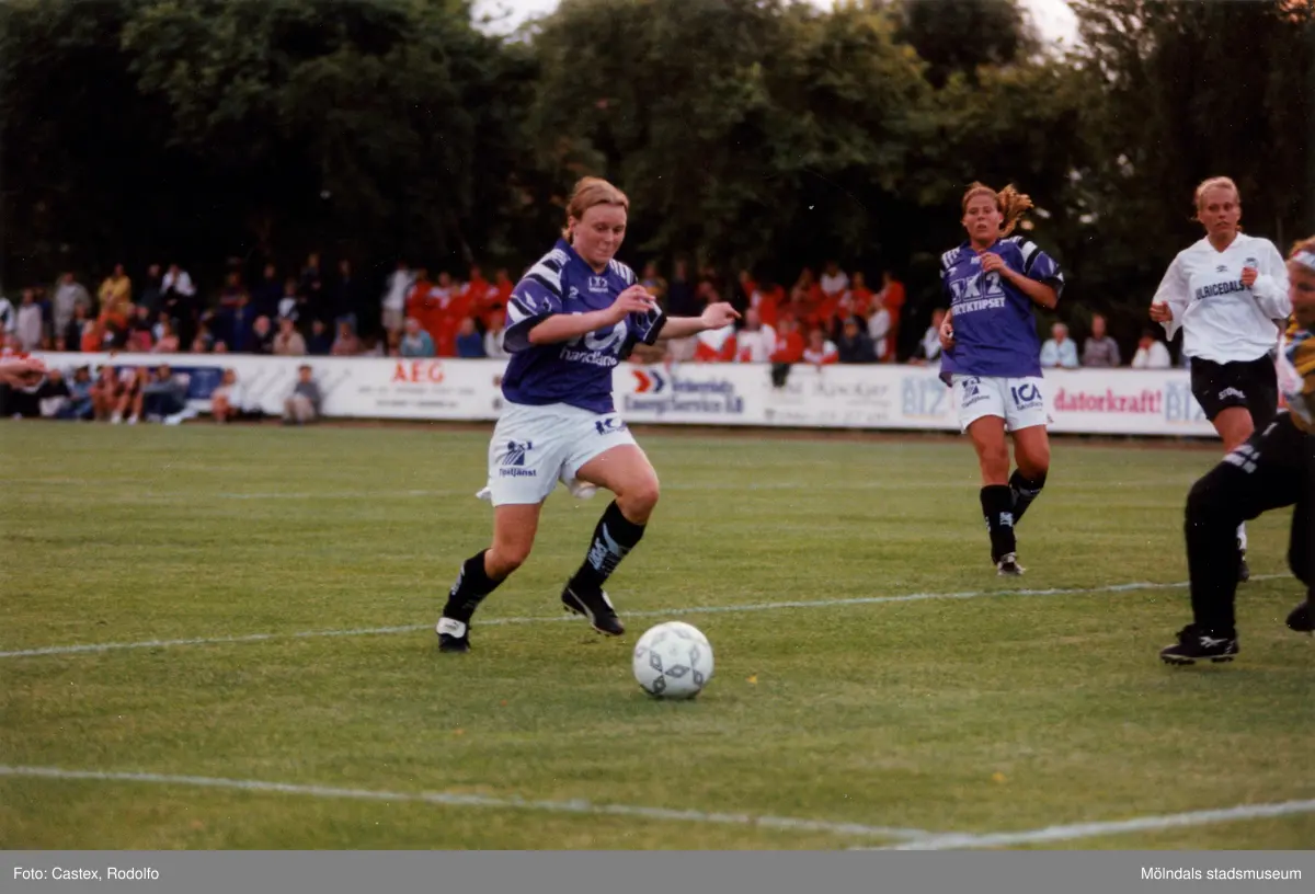 Titel: Fotbollslaget Jitex BK spelar match mot Veberöds AIF på Kvarnbyvallen i Mölndal, år 1996.