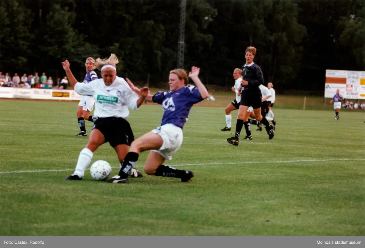 Titel: Fotbollslaget Jitex BK spelar match mot Veberöds AIF på Kvarnbyvallen i Mölndal, år 1996.