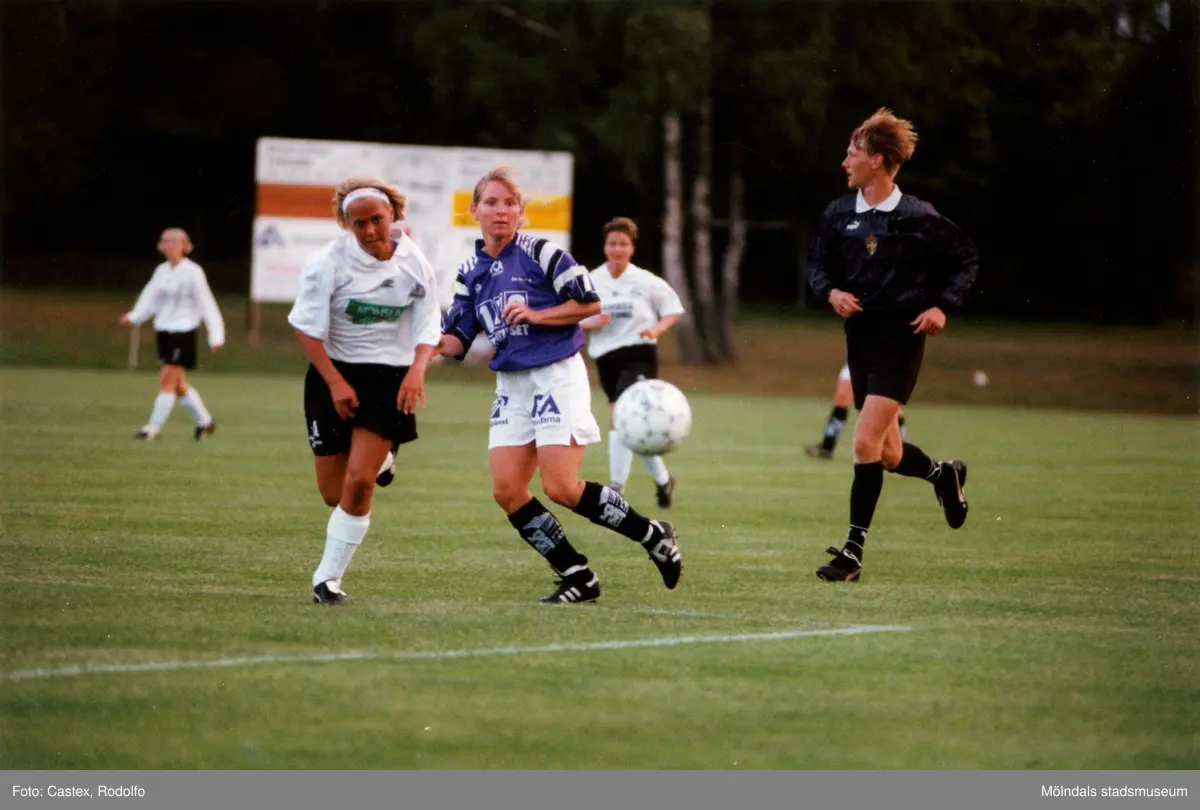 Fotbollslaget Jitex BK spelar match mot Veberöds AIF på Kvarnbyvallen i Mölndal, år 1996.