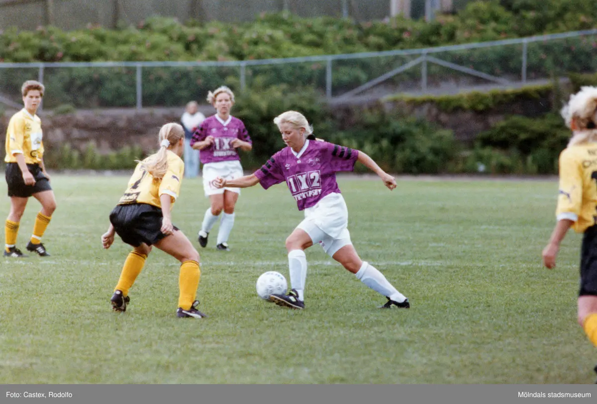 Fotbollslaget Jitex BK spelar match mot Lindsdals IF på Kvarnbyvallen i Mölndal den 29 maj 1993. Jitex BK förlorade matchen med 2-3.