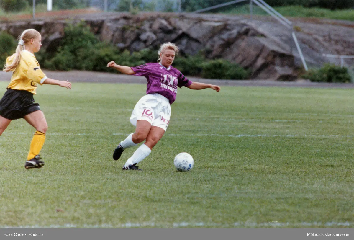 Titel: Fotbollslaget Jitex BK spelar match mot Lindsdals IF på Kvarnbyvallen i Mölndal den 29 maj 1993. Jitex BK förlorade matchen med 2-3.