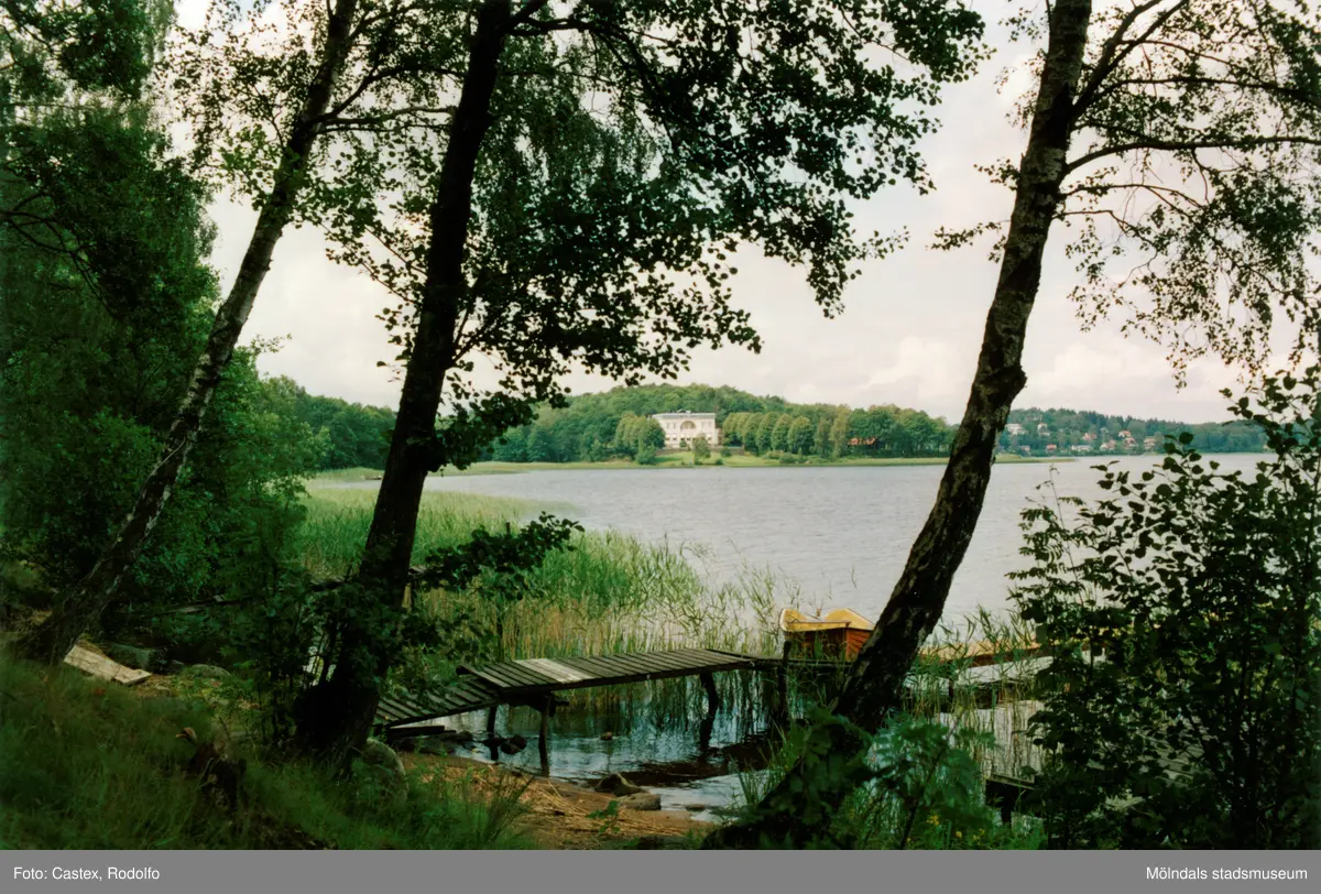En båt ligger förtöjd vid en brygga i Rådasjön, Mölndal, år 1994. I bakgrunden Slottsviken.