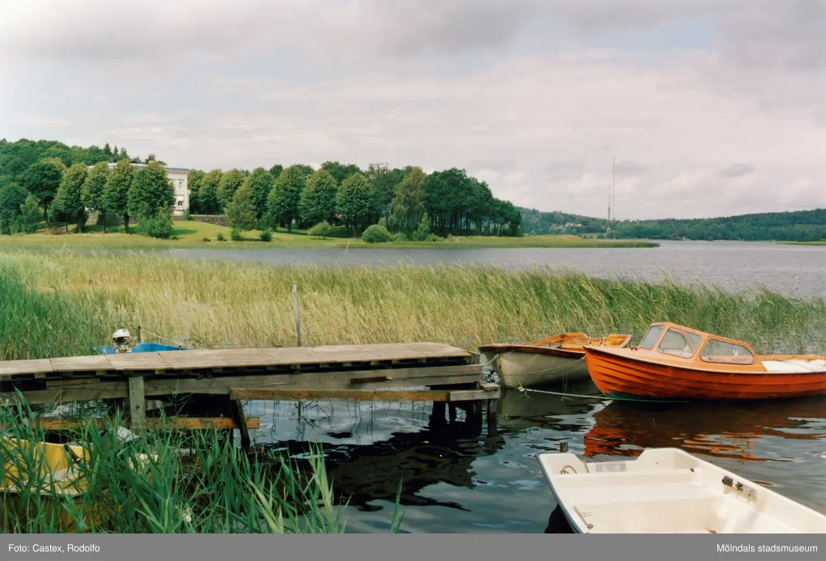 Småbåtar ligger förtöjda vid en båtbrygga i Rådasjön, Mölndal, år 1994. I bakgrunden Slottsviken.