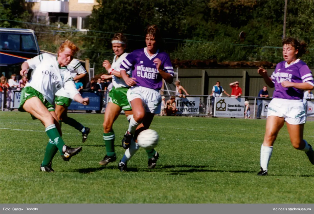 Fotbollslaget Jitex BK spelar match mot Stenkullen GoIK på Kvarnbyvallen i Mölndal i augusti 1988. Jitex BK vann matchen med 3-1.