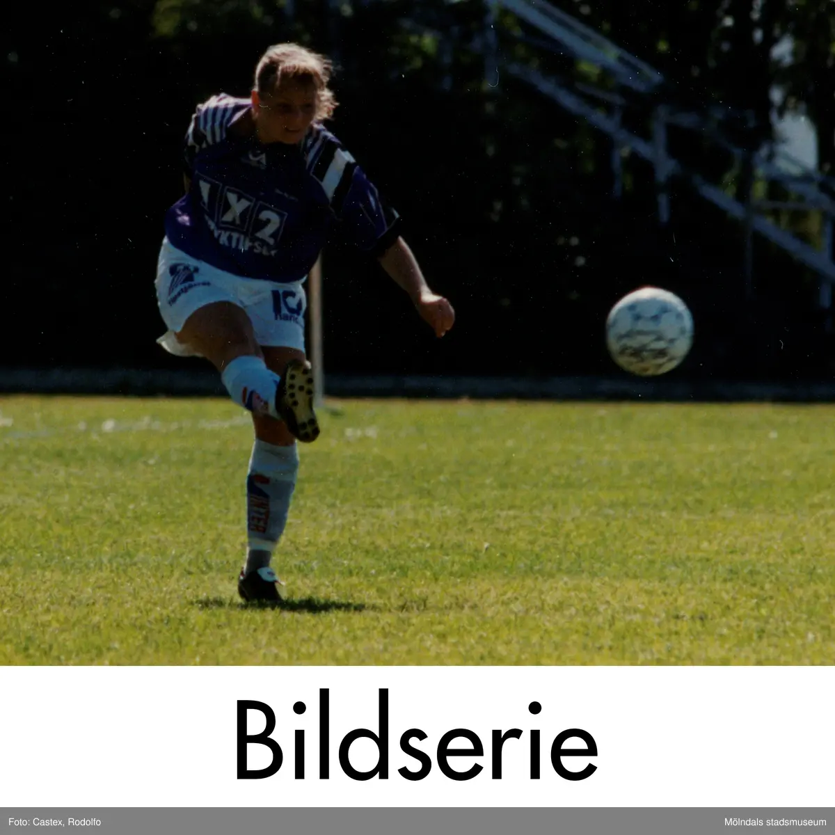 Serie om tre fotografier som visar fotbollslaget Jitex BK spela match mot Hammarby på Kvarnbyvallen i Mölndal, år 1996.