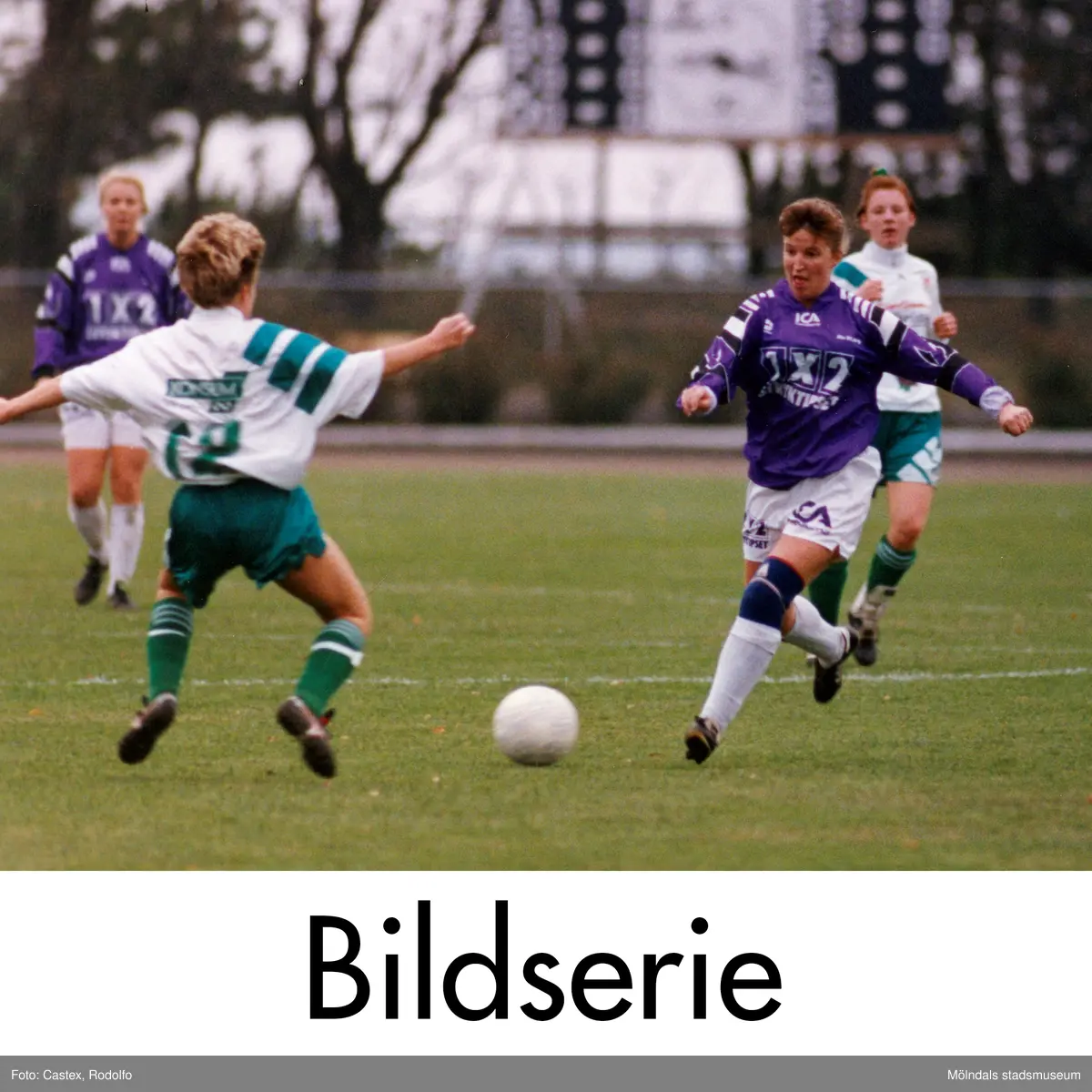 Serie om nio fotografier som visar fotbollslaget Jitex BK spela match mot Wä IF på Kvarnbyvallen i Mölndal, år 1994.