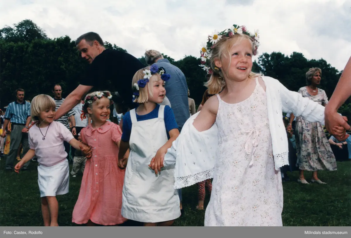 Titel: Midsommarfirande vid Gunnebo slott i Mölndal, år 1999. Dans kring midsommarstången för små och stora.