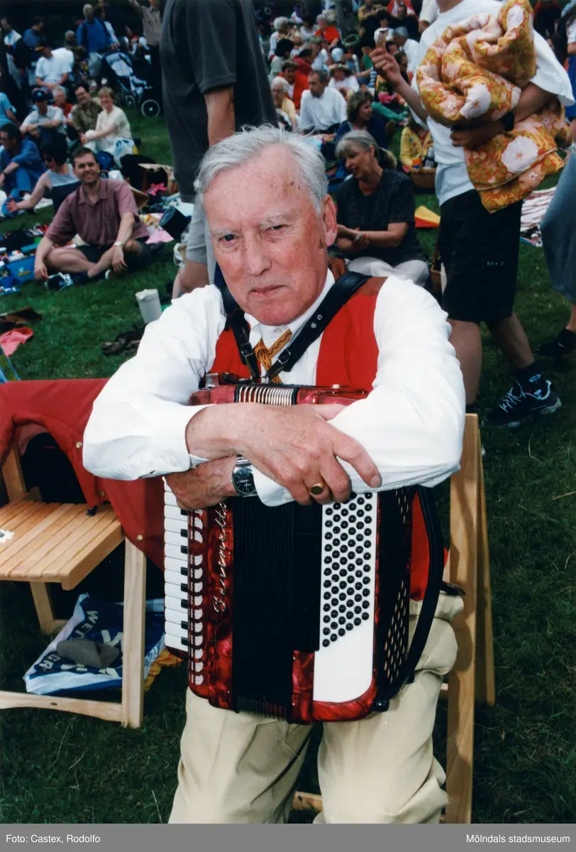 Midsommarfirande vid Gunnebo slott i Mölndal, år 1999. Porträtt av en man med dragspel.
