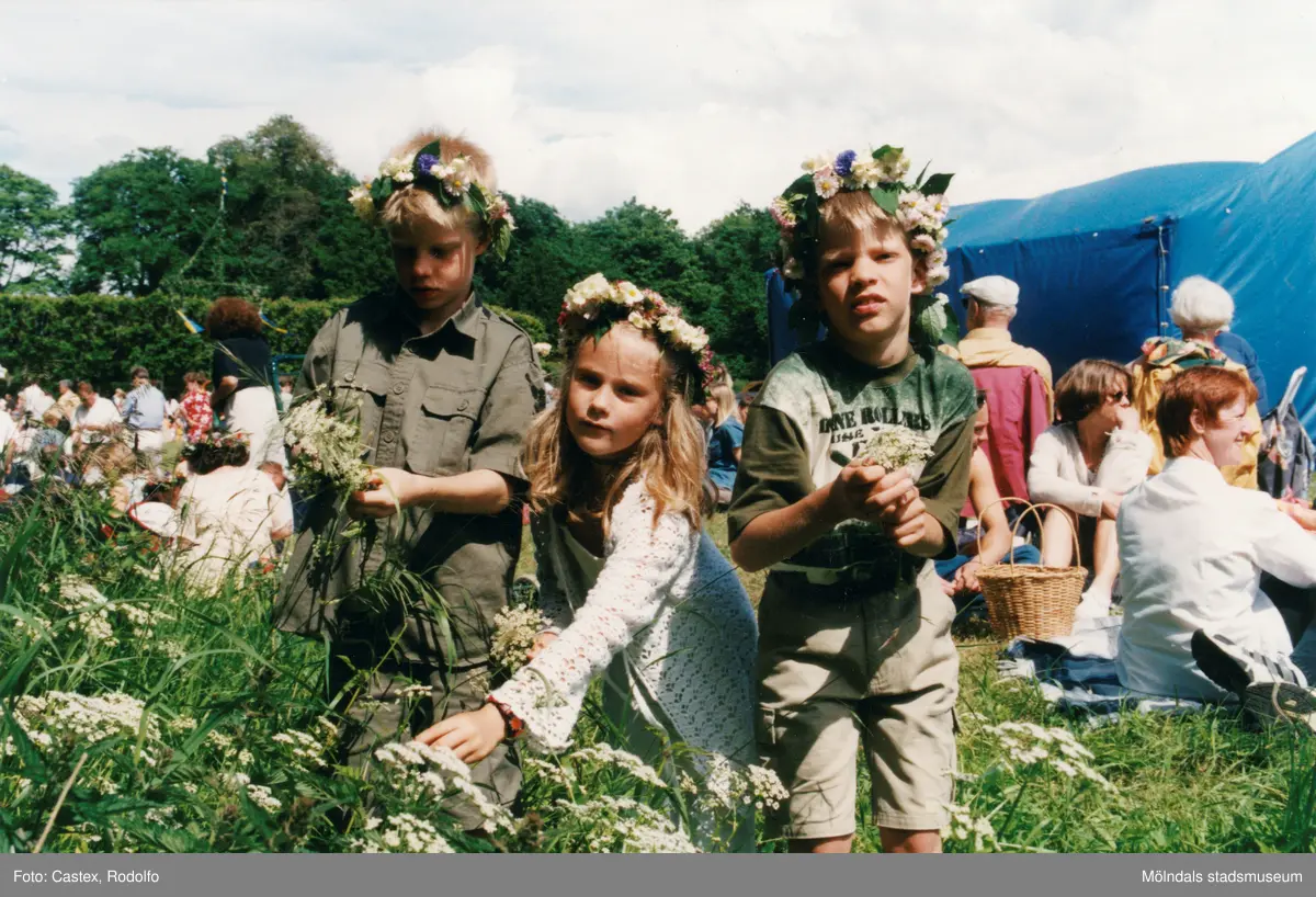 Midsommarfirande vid Gunnebo slott i Mölndal, år 1999. En flicka och två pojkar plockar blommor. Alla tre har blomsterkransar på huvudet.