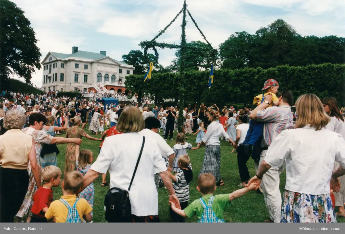 Midsommarfirande vid Gunnebo slott i Mölndal, år 1999. Dans kring midsommarstången för små och stora. Slottet i bakgrunden.