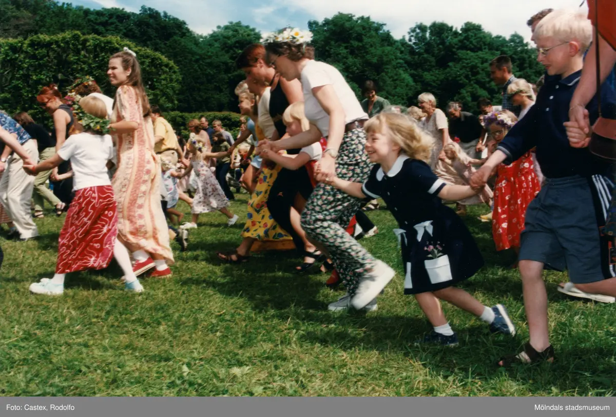 Titel: Midsommarfirande vid Gunnebo slott i Mölndal, år 1999. Dans kring midsommarstången för små och stora.