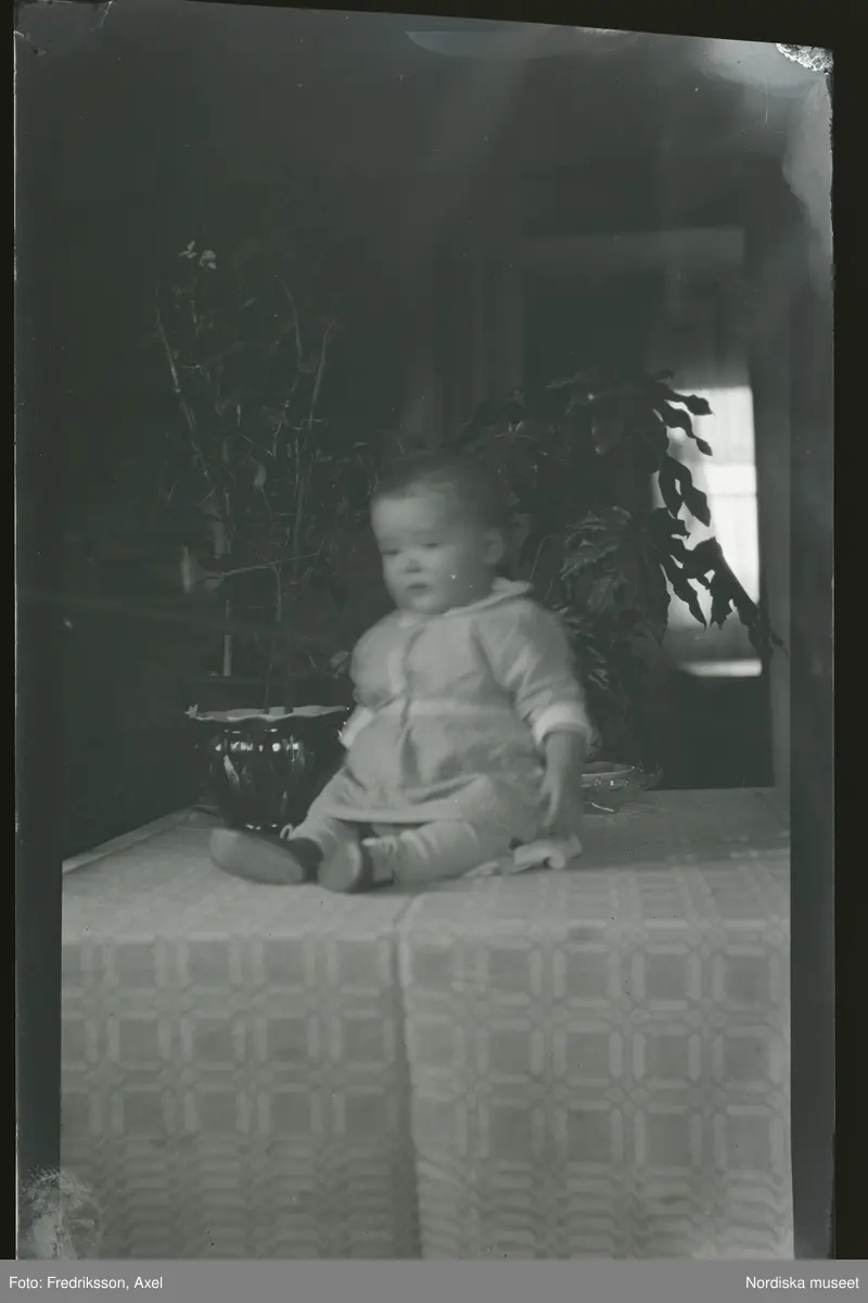 Titel: Porträtt av ett litet barn sittandes på ett bord i ett rum.