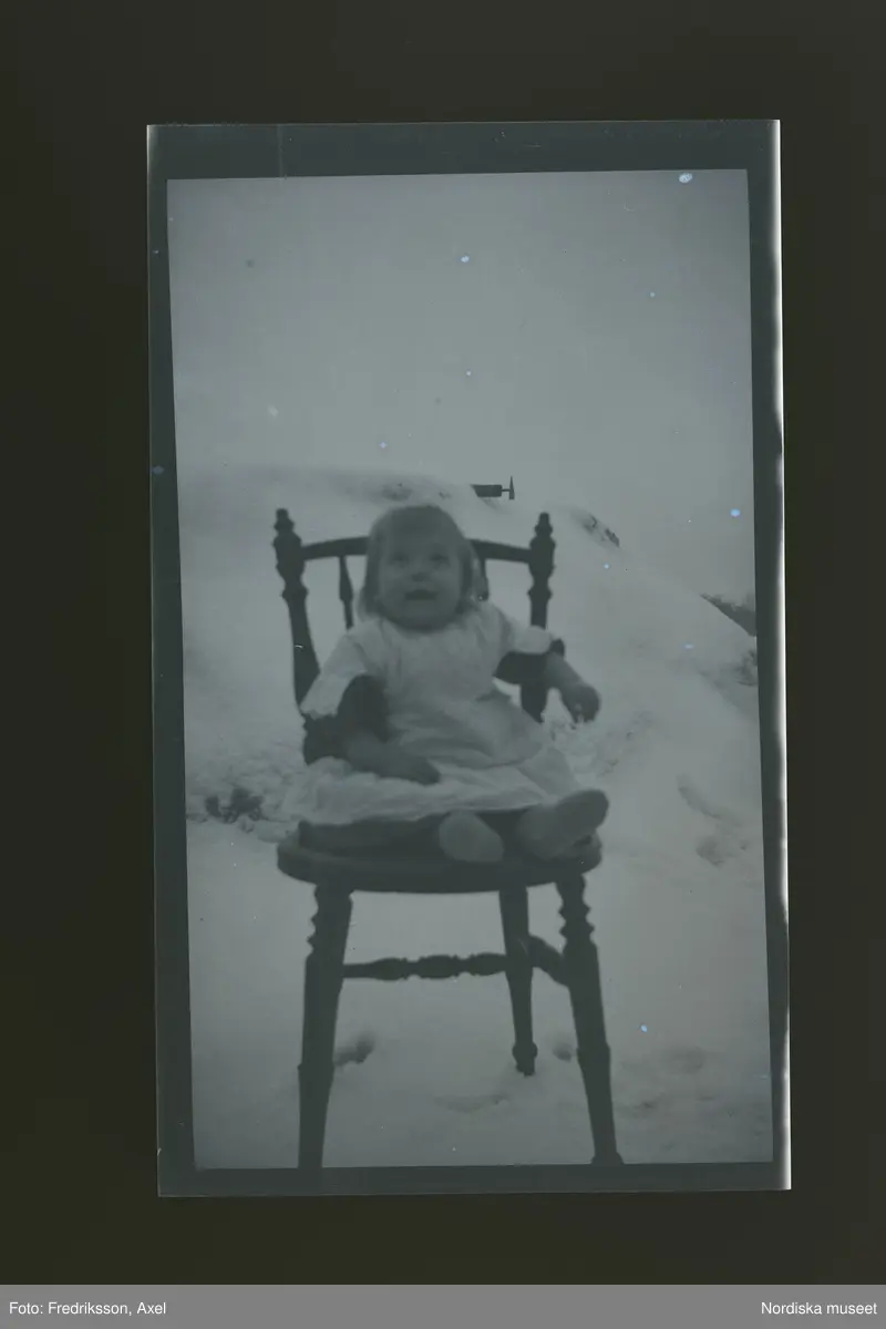 Porträtt av ett barn, sittande på en pinnstol utomhus i snö.