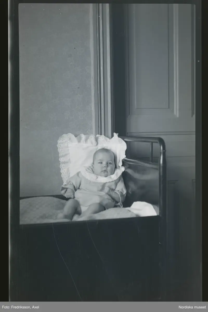 Porträtt av ett litet barn sittandes i en säng, lutad mot en spetskudde..