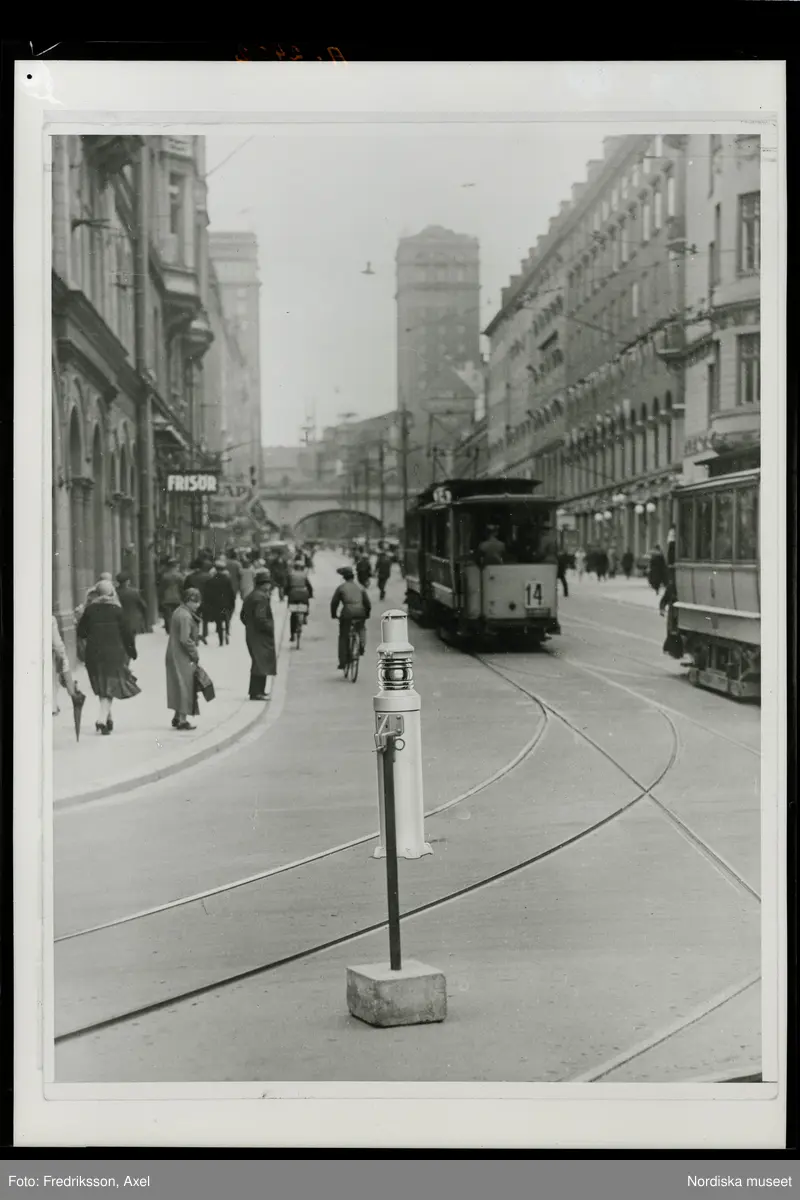Vy över Kungsgatan med Kungstornen, Stockholm. Spårvagnstrafik och fotgängare.