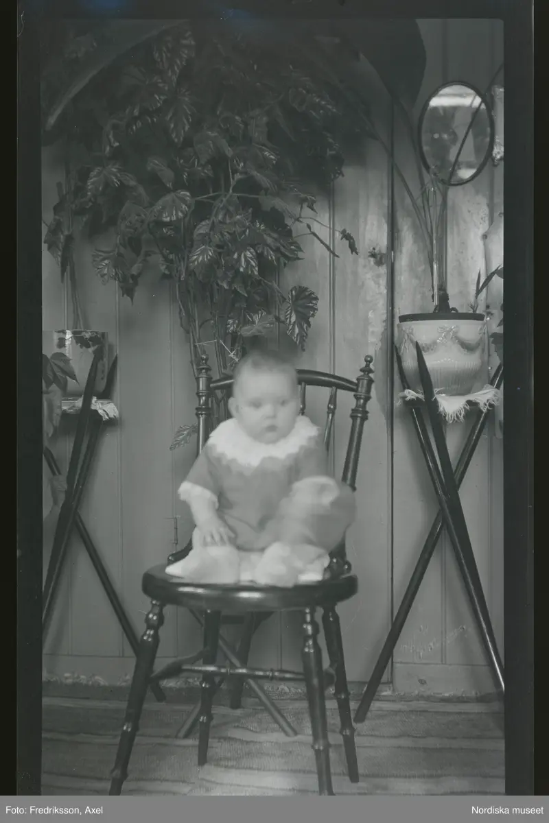 Porträtt av ett litet barn, sittande på en pinnstol i ett rum.