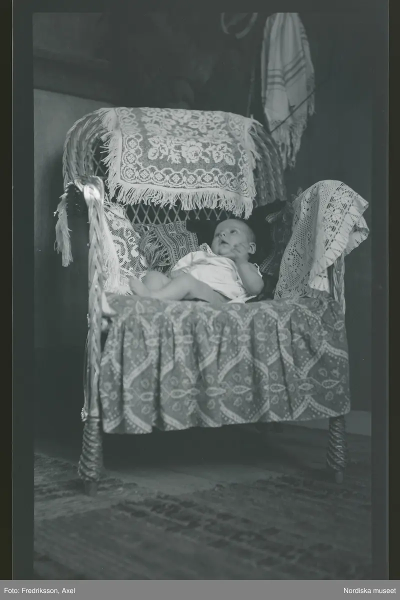 Titel: Porträtt av ett litet barn liggande i en korgstol.