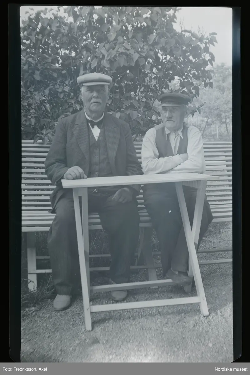 Titel: Två äldre män sitter på en bänk vid ett bord i en trädgård.