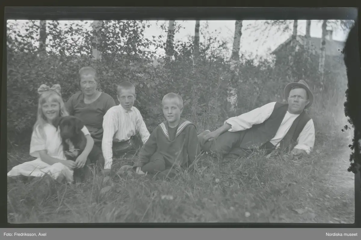 En familj poserar utomhus, sittandes i gräset. Dottern håller om en hund.